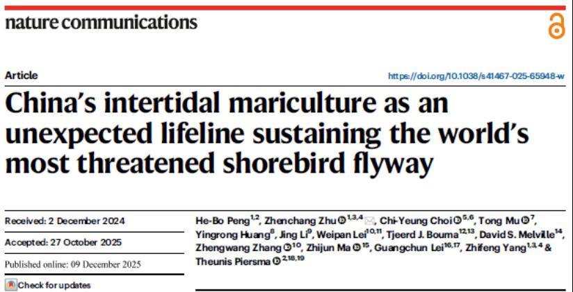 杨志峰院士团队祝振昌教授课题组在Nature Communications上发表了题为“China’s intertidal mariculture as an unexpected lifeline sustaining the world’s most threatened shorebird flyway”的研究论文,祝振昌教授为论文通讯作者,彭鹤博博士为论文第一作者。